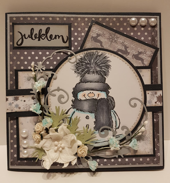 Så til lag på lag kortet. Her har jeg snudd fargene slik at jeg har brukt grå på skjerf og lue og blå på snø, med få justeringer. Papiret her kommer også fra Papirdesign.